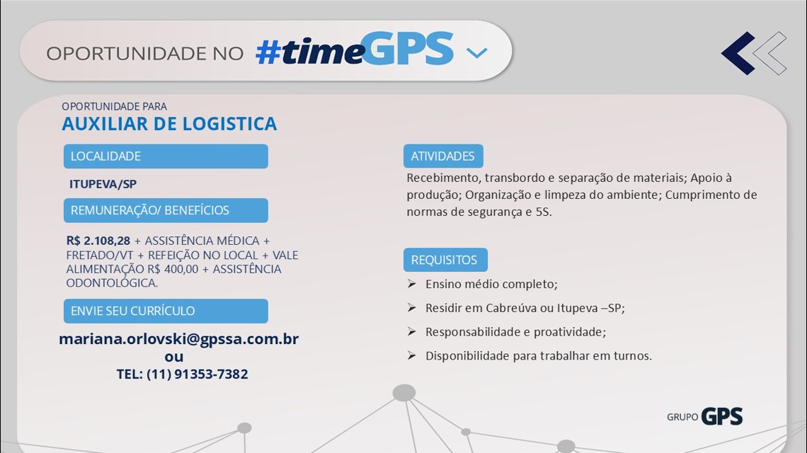 Oportunidade: Grupo GPS - Inhaus Industrial busca Auxiliar de Logística para atuar na área logística da Knorr Bremse.